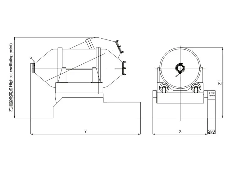 EYH系列二维运动混合机的转筒可同时进行二个运动,一个为转筒的转动,另一个为转筒随摆动架的摆动。被混合物料在转筒内随转筒转动、翻转、混和的同时,又随转筒的摆动而发生左右来回的掺混运动,在这两个运动的共同作用下,物料在短时间内得到充分的混合。EYH二维混科机适合所有粉、粒状物料的混合。外型示意图